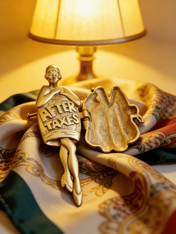 Standing at approximately 3″ tall, this figural brooch features a stylish woman in a luxurious fur coat — glamorous on the outside, funny on the inside. When you open her coat, she’s revealed wearing a barrel marked “After Taxes,” a cheeky commentary on life after the tax collector comes calling.